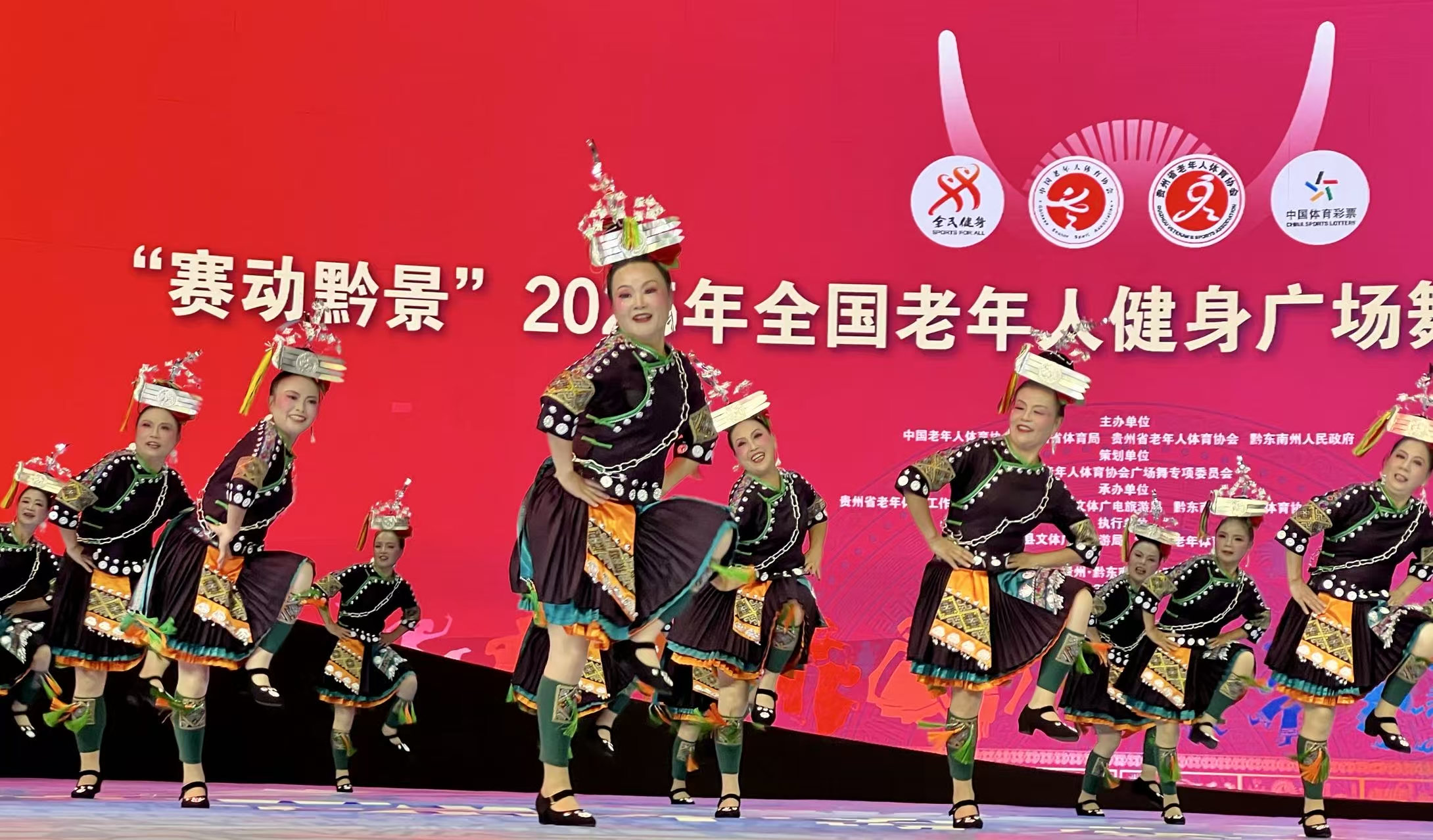在“赛动黔景”2025年全国老年人健身广场舞(民族类)展示交流活动现场,贵州黔东南州台江县代表队身着缀满稻穗纹样与苗绣的服饰,用改编自国家级非遗的《木鼓欢歌》,将苗族的劳作场景与丰收喜悦搬上了舞台。