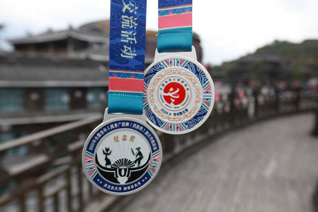 在全国老年人健身广场舞(民族类)展示交流活动期间,一枚枚独具魅力的纪念奖牌成为了这场盛事的荣耀见证,它们宛如苗族文化的璀璨使者,承载着深厚的民族底蕴与活动的热烈激情,散发着令人瞩目的独特光芒。