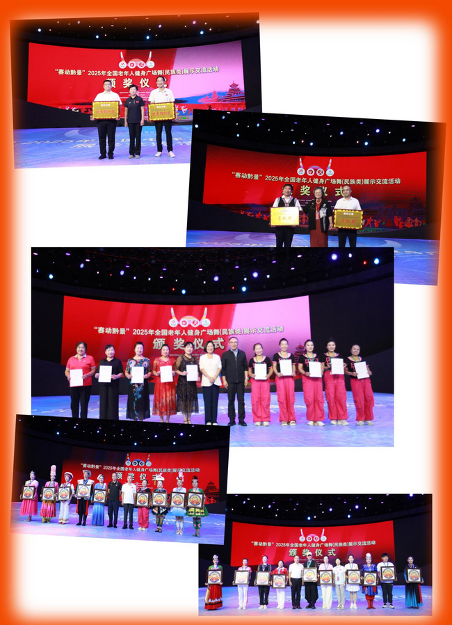 而这所有的欢腾与感动,都源自一场简约而庄重的颁奖仪式。联欢开始之前,大赛组委会依次为“百孚实业集团有限公司、贵州和美乡村非遗民族服饰T台秀”颁发“贡献奖”;为“黔东南州老年人体育协会、雷山县人民政府”颁发“优秀组织奖” ;为参加活动的代表队颁发“团体纪念奖”;为这次活动辛勤付出的志愿者颁授“志愿服务奖”。每一位领奖者脸上,都写满了自豪与感动。他们手捧的不仅是奖牌,更是一份对热爱与坚持的肯定,是“民族团结一家亲”的真切诠释。广场舞不仅强健了他们的体魄,更丰盈了他们的精神,让银龄岁月焕发新生。