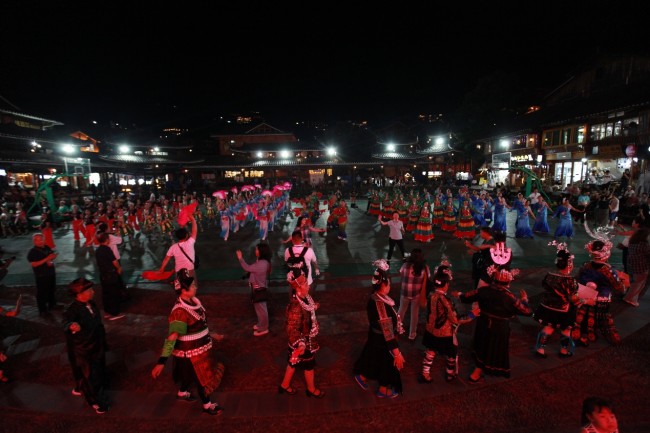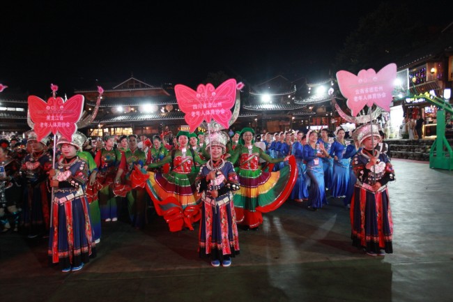 华灯初上,整个西江苗寨古街被装点得流光溢彩,来自全国各省区市的老年人健身广场舞队伍齐聚于此,共同开启了一场美轮美奂的视觉盛宴。精彩的舞蹈展演、多姿多彩的民族服饰,与欢快的笑声动人的旋律交织在一起,展现出别样的民族风情和银龄群体独有的风采。