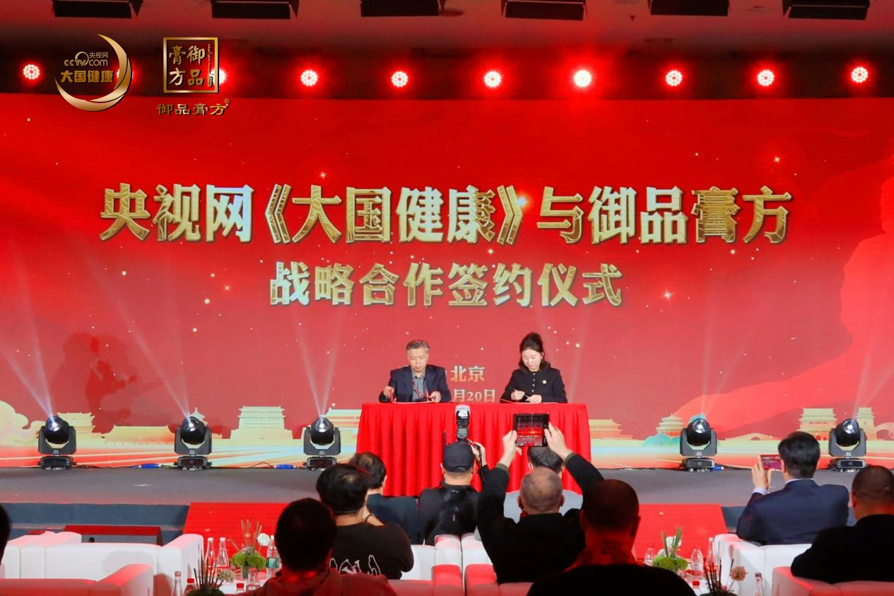 在思想碰撞之余,活动也迎来了重要时刻。央视网《大国健康》与御品膏方举行了战略合作签约,央视网老龄事业发展中心主任史健与御品膏方创始人姜洪英代表双方上台签约。
